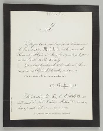 Zawiadomienie o pogrzebie na cmentarzu Montmartre.