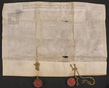 Dwie pieczęcie zawieszone na jedwabnych kolorowych sznurkach: biskupa poznańskiego Stefana Wierzbowskiego i kolegiaty Św. Jana w Warszawie. Ta ostatnia oderwana.