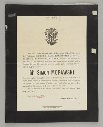 Do nekrologu dołączono wycinek prasowy "Nécrologie" Stamboul 31.01.1899.