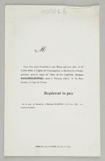 [Nekrolog. Incipit] M Vous êtes prié d'assister à une Messe, [...] Capitaine Jacques Nagorniczewski [...]. - [Miejsce nieznane : wydawca nieznany, 1858] (Paris : Prissette, succ. de Galban). - [1] k. złoż. ; 22x14 cm.