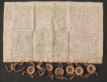 Osiem pieczęci zawieszonych na jedwabnych, czerwonych sznurkach.