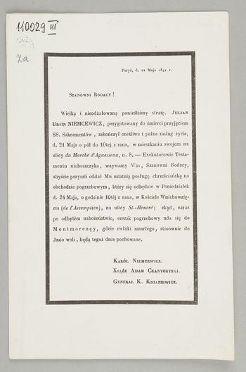 Zawiadomienie o pogrzebie na cmentarzu Montmorency.