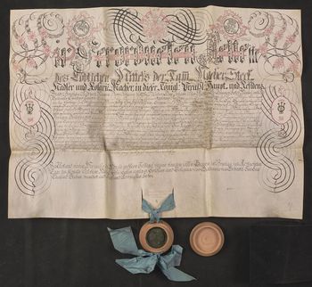 Pieczęć cechu rzemieślników: grzebieniarzy, iglarzy i wyrabiających różańce zawieszona na jedwabnej niebieskiej wstążce.