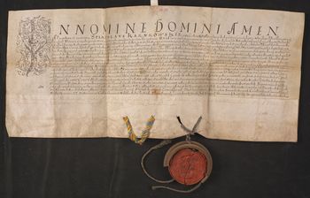 Pieczęć kapituły gnieźnieńskiej, pęknięta na pół, zawieszona na kolorowym sznurku, po pieczęci arcybiskupa Stanisława Karnkowskiego pozostał kolorowy sznurek.
