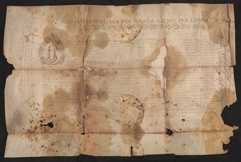 Pieczęci króla Jana III Sobieskiego brak, pozostały dziurki po sznurku i ślady jak po metalowej puszce do przechowywania pieczęci.