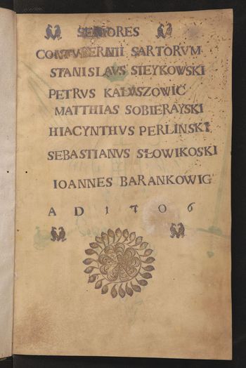 Na pierwszej stronie poszytu: "Seniores contubernii sartorum: Stanislaus Sieykowski, Petrus Kałuszowic, Mathias Sobierayski, Hiacynthus Perliński, Sebastianus Słowikowski, Joannes Barankowic. A. D. 1706".