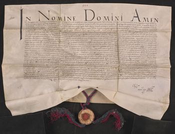 Pieczęć sygnetowa księcia Krzysztofa zawieszona na jedwabnym czerwono-granatowym sznurku.