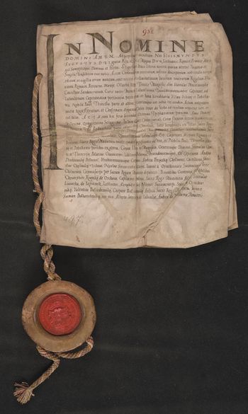 Pieczęć króla Zygmunta Augusta zawieszona na jedwabnym kolorowym sznurku, przeciągniętym przez grzbiet poszytu.
