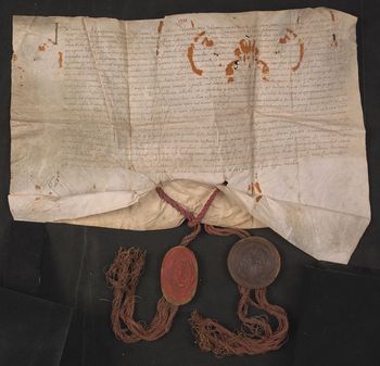 Dwie pieczęcie opata i konwentu zawieszone na czerwonych sznurkach.