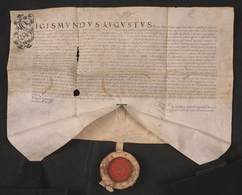Pieczęć króla Zygmunta Augusta zawieszona na pergaminowym pasku.