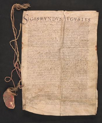 Ułamek pieczęci króla Zygmunta Augusta zawieszony na jedwabnym kolorowym sznurku.