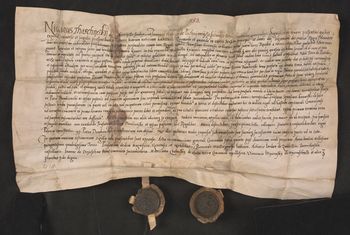 Dwie pieczęcie sędziów zawieszone na pergaminowych paskach, przy jednej ukruszona miseczka.