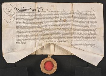 Pieczęć króla Zygmunta Starego zawieszona na pergaminowym pasku.