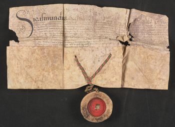 Pieczęć króla Zygmunta Starego zawieszona na jedwabnych czerwono-zielonych niciach. W środku pieczęci ubytek.