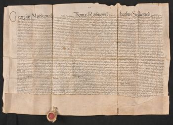 Pieczęć Jerzego Myszkowskiego zawieszona na pergaminowym pasku, po dwóch pieczęciach pozostały nacięcia na paski.
