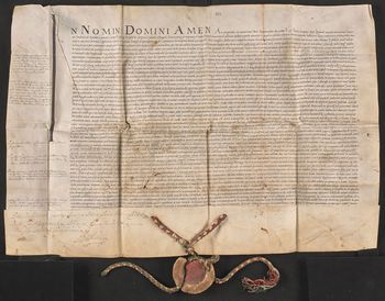 Pieczęć króla Zygmunta Starego zawieszona na jedwabnym żółto-zielono-czerwonym sznurku [obtłuczona, miska rozbita na pół].
