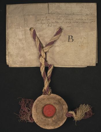 Pieczęć króla Zygmunta Starego zawieszona na kremowo-fioletowym jedwabnym sznurku.