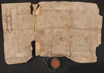 Pozostała jedna pieczęć zawieszona na niebiesko-białym sznurku, po drugiej nie ma śladu, ponieważ wydarty jest w tym miejscu dokument. Miseczka drewniana.
