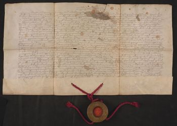 Pieczęć króla Zygmunta Starego zawieszona na jedwabnym czerwonym sznurku.
