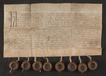 Osiem pieczęci zawieszonych na pergaminowych paskach, po dziewiątej pozostał pasek.