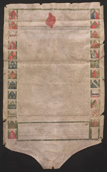 Dokument jest XVIII-wieczną kopią, tekst otacza ramka utworzona z wymalowanych herbów dwudziestu pięciu baronów angielskich.