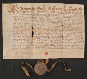 Pieczęć miasta umieszczona w misce, zawieszona na jedwabnej pomarańczowej wstążce.