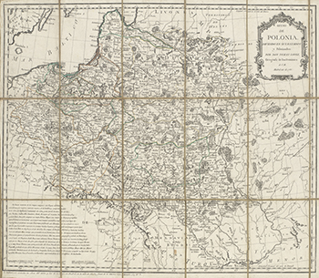 Reyno De Polonia, : Dividido En Sus Estados y Palatinados: / Por Don Tomas Lopez, Geografo de los Dominios de S. M. - Madrid : [López de Vargas Machuca, Tomás], 1786. - 1 mapa : miedzior. kolor., rozcięta na 18 części i nalepiona na płótnie ; 45,0x52,0 cm, na ark. 48,0x61,0 cm, złoż. 17,0x11,0 cm.