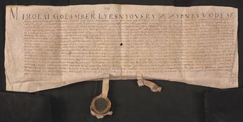Zygmunt król polski nakazuje Andrzejowi Podoleckiemu dziedzicowi Koropuża i części Dublan stawić się przed sądem ziemskim lwowskim na pozwanie Katarzyny Tarnowskiej o bezprawne posiadanie jej dziedzicznej części Dublan, Lwów 8 XI 1543.