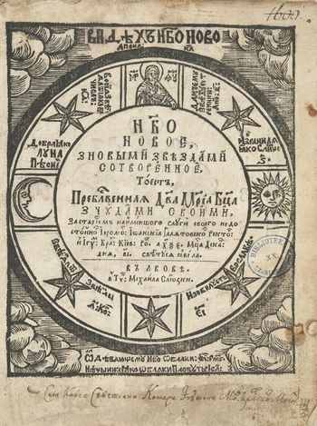 Tytuł w ramce, drzeworyt z przedstawieniem wpisanego w kwadrat koła, złożonego z gwiazd, książyca i słońca, w górze Maryja, środek koła wypełniony tytułem.