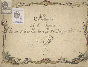 Okładka przednia zeszytu nutowego ozdobiona kolorową ramką, którą tworzą miniaturki aniołków, instrumentów muzycznych i roślin.