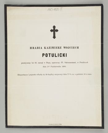 [Nekrolog. Incipit] Hrabia Kazimierz Wojciech Potulicki przeżywszy lat 60 [...]. - [Miejsce nieznane : wydawca nieznany, 1880] (Nakło : R. Giroud). - [1] karta złożona ; 27x22 cm.