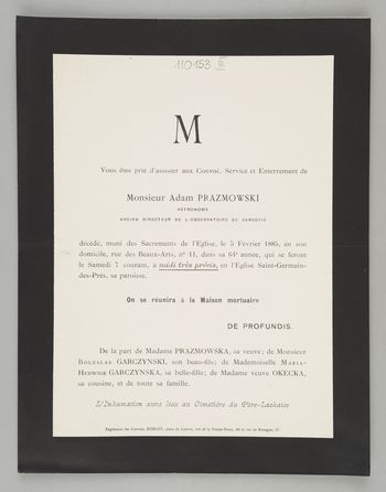 Zawiadomienie o pogrzebie na Cmentarzu Père-Lachaise.