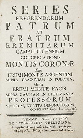 "Reverendissimo Patri Don Parisio Brixiensi, Congregationis Eremitarum Camaldulensium Montis Coronae Praesuli Majori Dignissimo, Patri, Protectori, Maecenati Amplissimo Salutem & Prosperitatem" podp. Don Seraphinus E.C.M.C. Prior Montis Argentini (Andrychiewicz Serafin).