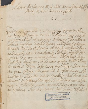 Korespondencja różnych do różnych: -Lubomirski Jan [Kazimierz star. bolemowski], k[awaler] m[altański] do [Adama Mikołaja Sieniawskiego hetm. w. kor., kaszt. krak. 1713 s. 131-134. -Lubomirski [Stanisław Herakliusz marsz. n. kor.] do [Mikołaja Hieronima Sieniawskiego, chor. w. kor.] 1671 s. 65-66. -Lubomirski [Jerzy Dominik podkom. kor.] do Adama Mikołaja Sieniawskiego hetm. w. kor., kaszt. krak. (3) 1710-1724 s. 83-84, 233, 365-367. -Lubomirski M[ichał podstoli kor.] do Adama Mikołaja Sieniawskiego hetm. w. kor. 1702 s. 503-504. -Lubomirski T[eodor star. spiski] do Adama Mikołaja Sieniawskiego hetm w. kor., kaszt. krak. 1724 s. 217-218.