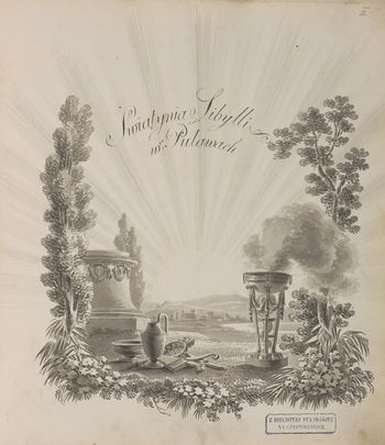 "Świątynia Sybillli w Puławach" : "Poema historyczne w 4 pieśniach". - [około 1780-1829]. - 114 stron + XII s. + [1] k.ochr. : Na s. V akwarela biało-czarna. Na s. VII akwarela przedstawiająca widok pałacu Czartoryskich i Świątyni Sybilli ; 29 x 26 cm.