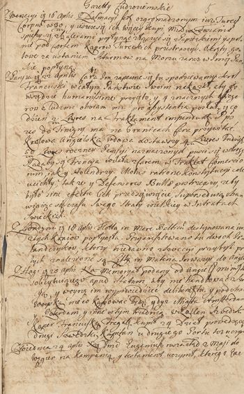 Gazety pisane: -Z Adrianopola, b.d. s. 240. -Z Antwerpi, b.d. s. 53. -Z Barcelony, b.d. s. 7. -Z Basel, b.d. s. 239. -Z Berlina, (3) 30 VIII 1720 s. 54, 175, 177-180, 222. -Z Bostonu, 4 VII 1720 s. 173. -Z Brzeżan, b.d. s. 145-146. -Z Budziacza, b.d. s. 137-138. -Z Chocimia, b.d. s. 215. -Z Frankfurtu, b.d. s. 52-53. -Z Gdańska, (3) b.d. s. 151-152, 155-157, 186-187, -Z Genui, b.d. s. 51. -Z Girone, b.d. s. 239. -Z Hagi, (8) 24 VIII 1720 s. 1-2, 5, 7, 53, 111-112, 116-117, 174, 184, 197. -Z Hamburga, (7) 31 VIII 1720 s. 27-28, 113, 118, 175-176, 182, 184, 198, 221. -Z Holandii, b.d. s. 221. -Z Holsztyńskiego, (10) 27 VIII 1720 s. 3, 6, 8, 112-113, 118, 175, 182, 184, 198, 240-241. -Z Insuły S. Christophi z Zach. Indii, 20 IV 1718 s. 51. -Z Kamieńca, b.d. s. 231. -Z Kassel, 20 VIII 1720 s. 174. -Z Kolna, b.d. s. 183. -Z Kopenhagi, (5) 24 VIII 1720 s. 117, 131, 175, 182, 184. -Z Krakowa, b.d. s. 187-188. -Z Krymu, 1724 oraz b.d. s. 89, 91, 107. -Z Lewantu, 17 IX b. r. s. 93-96. -Z Liworno, (2) b.d. s. 51, 181. -Z Lizbony, b.d. s. 1, 239. -Z Londynu, (9) 16 VIII 1720 s. 1, 5, 7, 52, 111, 116, 174, 183, 239. -Z Lwowa, b.d. s. 97-98. -Z Mayntz, b.d. s. 52. -Z Mediolanu, b.d. s. 52. -Z Meklemburgii, (5) b.d. s. 6, 8, 118, 182, 198. -Z Obozu z pod Rygi, (2) b.d. s. 227-228. -Z Paryża, (11) 20 VIII 1720 s. 1, 5, 7, 111, 115, 151, 174, 181, 183, 197, 239. -Z Petersburga, (2) b.d. s. 52, 199. -Z Portu Herkole, b.d. s. 241. -Z Poznania, (2) b.d. s. 131, 185. -Z Rygi, b.d. s. 8. -Z Rzymu, (2) b.d. s. 51, 173-174. -Z Rzeszy, b.d. s. 121-122. -Z Skanii, b.d. s. 240. -Z Stralzundu, b.d. s. 1. -Z Szczecina, b.d. s. 184. -Z Sztokholmu, (2) 10 VIII 1720 s. 8, 174-175. -Z Szwecji, b.d. s. 117. -Z Torunia, (4) b.d. s. 6, 54, 132, 185-186. -Z Turcji, b.d. s. 109-110, 139, 163, 217-220. -Z Ukrainy, b.d. s. 79. -Z Warszawy, (5) 25 III 1723 s. 47-48, 123-124, 147-149, 188-191, 223. -Z Wenecji, (4) b.d. s. 5, 52, 115, 240. -Z Węgier, (2) 7 IX 1690 s. 59, 127. -Z Wiednia, (13) 7 IX 1690-21 VIII 1720 s. 2-3, 5-6, 7-8, 53-54, 60, 112, 117, 151, 174, 181, 183-184, 197, 239-240. -Z Wilna, b.d. s. 228-230. -Z Wrocławia, b.d. s. 222. -Z ziemi Hadelskiej [?], b.d. s. 3. -Wypisy z „listów cudzoziemskich”, b.d. s. 54-56. -Gazeta pisana dot. różnych stron świata, b.d. s. 67. -„Nowiny cudzoziemskie”, b.d. s. 119-120, 193-196. -"Relacya Sensuum na konferencji wyrażonych", b.d. s. 13-16. -"Relacja z listów berlińskich", [1718] s. 23-24. -Diariusze - wypisy z różnych gazet, 6-29 IX [1717?] s. 39; 20-21 IX b. r. s. 43-46; 1-3 VIII b. r. s. 61-62; s. 65-66; 1-3 VIII b. r. s. 69-71; 8-14 XII b. r. s. 75-78; 17-20 VII b. r. s. 85-87; 16-19 IX b. r. s. 103-106; 23-24 VIII b. r. s. 225-226; 21-22 XII b.d. s. 233-234; 27 XI b.d. s. 235-237. -Krótka relacja i przestroga wiernym patriotom polskim, b.d. s. 73-74. -Wiadomości z granicy poł.-wsch. [1724] s. 101-102, 141-144, 213-214. -Nowiny z różnych krajów Europy, b.d. s. 125-126, 159-160. -Nowiny z różnych miast w Rzeczpospolitej, b.d. s. 129-130.