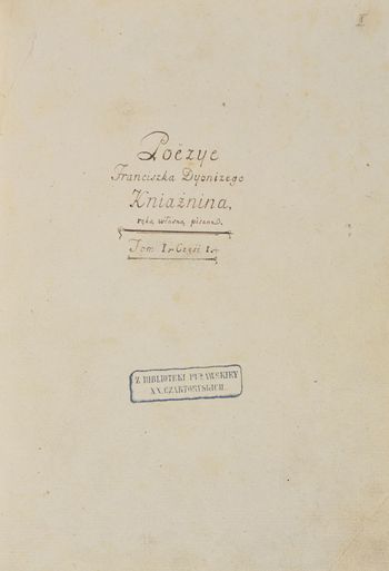 Skóra czerwona, złocone ramki, na grzbiecie złocony tytuł: "Poezye Franc. Dyon. Kniaźnina 1".