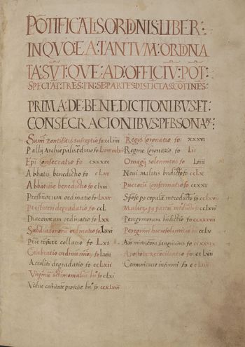 Pontificalis ordinis liber, in quo ea tantum ordinata sunt, que ad officium pontificis spectant, tres in se partes distinctas continens". [f.1] Incipiunt benedicciones solennes pontificales, quas soli pontifices dicunt in fine missarum ante Agnus Dei vel post Ite missa...; f.36 52 "Incipit ordo ad regem benedicendum consecrandum et coronandum quando novus a clero et populo in regem sublimatur"; f.52 53 v. "Benediccio et coronacio regine"; f.53 v. 54 "Sequitur de omagio faciendo. Informacio cum aliquis princeps alicui regi prestare debet omagia" f.34 v. "Tradicio pallii. Hac forma verborum utitur episcopus Cracoviensis in tradicione pallii metropolitano Gneznensi, quem de iure et consuetudine consecrare et eidem in sua consecracione primus inter alios provincie Gneznensis episcopos manu imponere debet"; f.55-57 desunt; f.58-138 De ordinatione clericorum; f.84-88 "Ordo fundacionis nove ecclesie"; f.139 152 v. "Episcopi consecracio"; f.153 160 v. "De benediccione abbatis"; f.161 168 v. "Consecracio virginum; f.169 171 v. "Benediccio candelabrum in festo purificacionis beate Marie virginis"; f.171 v. 173 v. "Benediccio cinerum"; f.173 v. "Benediccio palmarum"; f.173 v.-183 v. "Feria quinta in cena domini circa horam terciam penitentes, ad ecclesiam per episcopum introducantur hoc modo"; f.183 v. 185 v. "Ordo in feria quinta cene domini"; f.185 v.-193 v. "Prefationes"; f.194 v. 194 v. "Formula benediccionis; f.199v. "Exorcimus ad infirmos"; f.199 v. 210 "Benediccio olei"; f.210 v. 211 v. "Ordo feria sexta in die parasceues"; f.212 215 "Ordo in sabbato sancto Pasche"; f.215-220 "Campane benediccio"; f.220 v. 224 v. "Consecracio seu benediccio indumenti seu ornamenti ecclesiastici; f.224 v. 225 v. "De confirmacione puerorum"; f.225 v.-227 v. "De benediccione nove crucis vel tabule in qua crucifixus est depictus"; f.228 229 v. "Benediccio imaginis beate Marie Virginis"; f.230-233 "De benediccione sacrorum vasorum et aliorum ornamentorum in generali"; f.233 234 "De benediccione vini in amore s. Iohannis"; f.234-234 v. "De benediccione panis in paschate"; f.234 v. 235 "De benediccione casei, ovorum et mellis"; f.235 236 "Benediccio generalis ad omne id quod volueris"; f.235 v.-236 "Benediccio nove domus"; f.236 236 v. "De benediccione agrorum"; f.236 v. "Benediccio salis"; f.236 v. 238 v. "De benediccione baculi et peregrinorum"; f.238 v. "Benediccio ante minucionem sanguinis"; f.238 v. "Benediccio balnei"; f.239-242 "Incipit ordo adindumenti ad paramenta episcoporum"; f.242 247 v. "Forma sinodum p.144 celebrandi"; f.247 v. 249 "Benediccio vidue que fuerit castitatem professa"; f.249 250 "Visitacio sepulcri in die resurreccionis domini"; f.250 252 "Ordo ad clericum degradandum"; f.252 252 v. "In die parasceues cristi"; f.252 v. 253 v. "Ordo professionis fiendae"; f.253 v. 254 "Ordo ad accipiendum summum pontificem"; f.254 255 "Ordo ad communicandum infirmum"; f.255 256 "De benediccione et imposicione cilicii"; f.256 "Benediccio armorum et vexilli bellici"; f.256 256 v. "Benediccio gladii"; f.256 v. 258 v. "Ordo ad reconciliandum apostatam, scismaticum vel hereticum"; f.258 v. 259 "Benediccio armorum"; p.259 259 v. "Benediccio gemmarum"; f.259 v. 260 "Benediccio novi militis"; f.260 "Ensis novi benediccio": p.260 v. 262 "Pallium quando datur archiepiscopo"; p.262 263 v. "Ordo ad accolitum clericum degradandum"; p.263 v. 266 Benedicciones agni, lardi, casei, ovorum, panis etc.; f.266 266 v. "Introduccio mulieris post partum"; f.266 v. 267 "Ad introducendum sponsam post copulam".