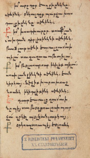 [Zbiór modlitw i pieśni, psalmów i hymnów ormiańskich, z przekładem kipczackim oraz godziny kanoniczne ormiańskie]. - 1 połowa XVII w. - 476 stron : 30 wierszy na stronę, pismo notrgir, dwie ręce, kilka kolorów tuszu ; 8,6 x 13,5 cm.