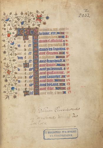 Kalendarz pisany kolorem niebieskim i czerownym, ważne święta złotym, inicjały KL niebieskie i czerwone na złotym tle, wokół miniatur bordiury z elementami roślinnymi.