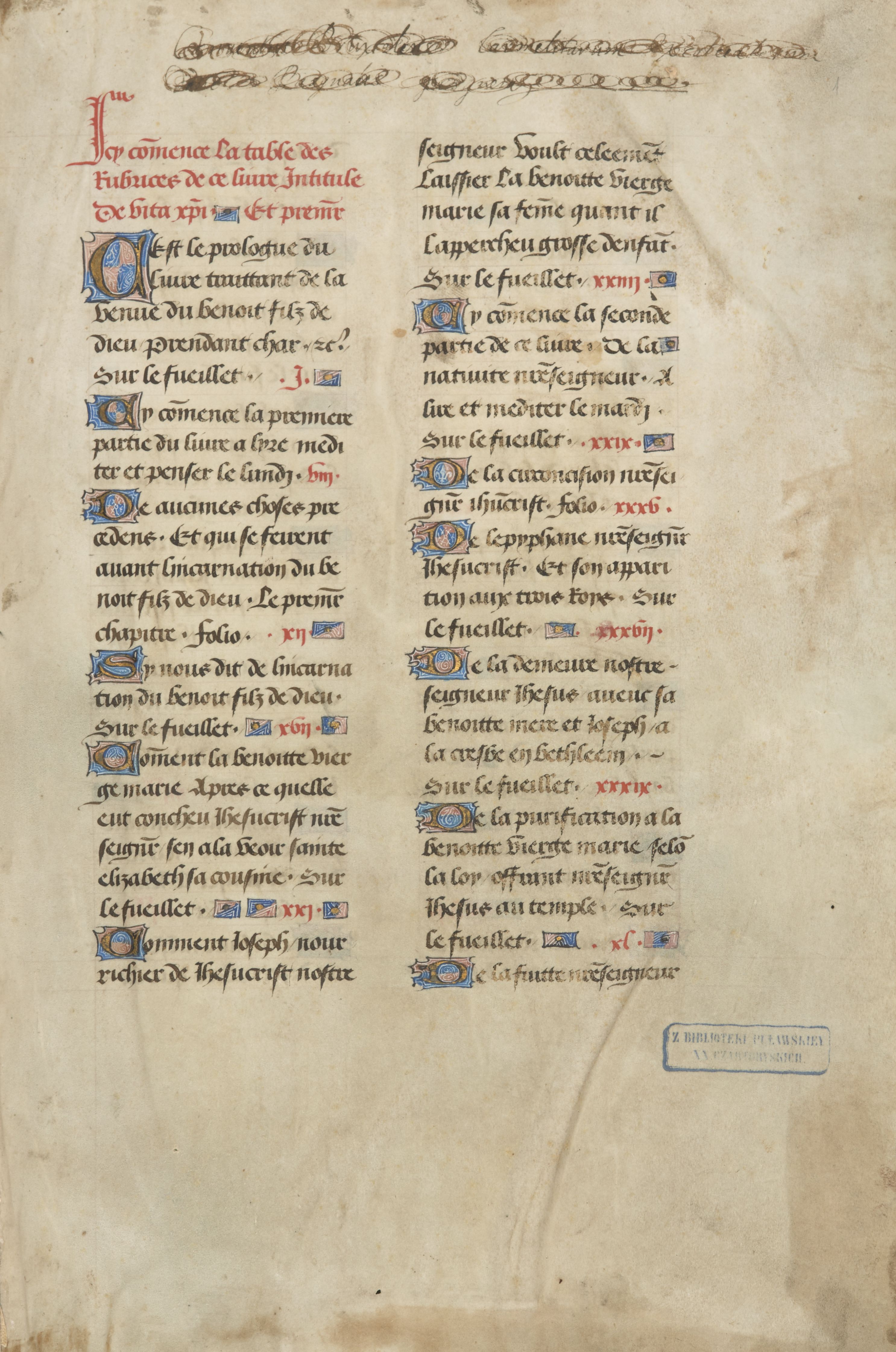 Luksusowy rękopis fundacji namiestnika burgundzkiego w Lille Gillaume'a de Ternay, wymienionego w kolofonie (s. 400). Dekoracja malarska: 12 miniatur barwnych i "en grisaille", w tym całostronicowa scena dedykacyjna (s. 9); motywy heraldyczne.