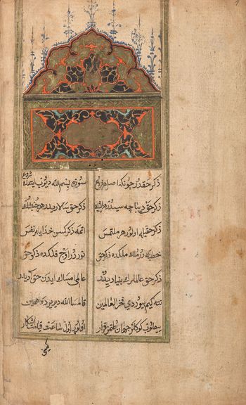 Poemat religijny Maḳtel-i Ḥuseyn Lâmiî Çelebi (1472-1533) przed 1533 r. - Turcja, [około 1501-1600]. - 50 kart : 2 kolumny, 11 wierszy na stronie. Pismo nashi. 8 miniatur dużej wartości. Objaśnienia rozdziałów rubrem. Frontispis zdobiony, na tekście ślady złotego piasku ; 27,5 x 17,5 cm.