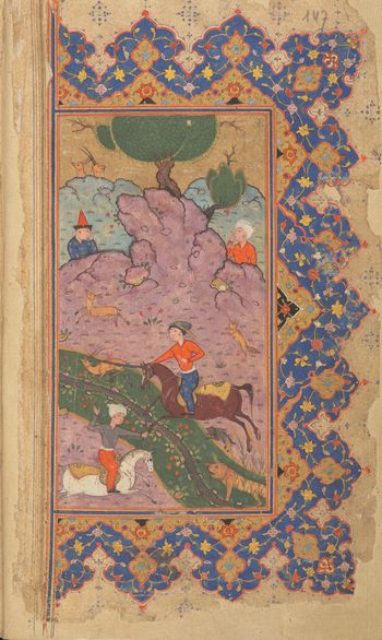 Divan Wschodni Gazele w kolejności rymu Hafez, Hafiz, Szamsuddin Mohammad (1319-1369). - Persja, [około 1501-1600]. - 145 kart + [2] k. ochronne przednie + [2] k. ochronne tylne : 2 kolumny tekstu, 14 wierszy na stronie, 4 miniatury, tekst rubrykowany, zdobiony, pismo nasta`lik, karty zdobione i złocone ; 20,2 x 12,5 cm.