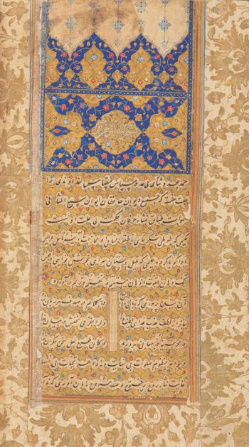 Divan Wschodni Gazele ułożone wg rymu, masnavi itp. Hafez, Hafiz, Szamsuddin Mohammad (1319-1369). - [około 1501-1600]. - 189 kart + [1] k. ochr. przednia + [1] k. ochr. tylna : 3 miniatury szkoły safawidzkiej, tekst zdobiony i złocony, w 2 kolumny, 15 wierszy na stronie, pismo nasta`lik ; 23 x 13,5 cm.