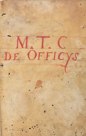 1. k. 2r-66v: Marcus Tullius Cicero, De officiis cum glossis marginalibus et interlinearibus ǁQuis est enim qui in (!) nullis offitii preceptis philosophum tradendis se audeat dicere... Placet igitur quoniam disputatio ...X... sed multo fore cariorem, si talibus monimentis [recte: monitis] preceptisque letabere. – Deo gracias. Amen.