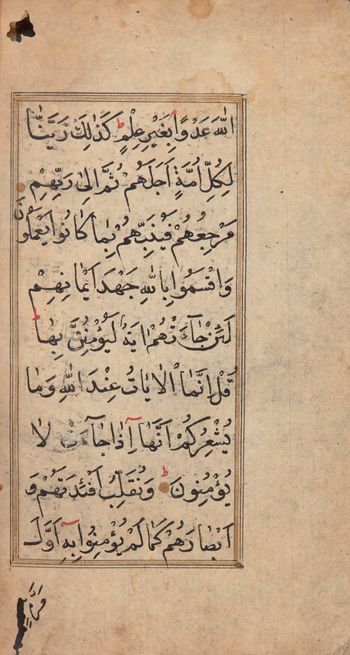 Koran - fragmenty Modlitwy muzułmańskie. Brak początku i końca rękopisu XVIII w. Kodeks - [1701-1800]. - 130 kart. Foliacja na sposób arabski : Pismo jednej ręki. Tekst w ramkach, rybrykowany i złocony. Tytuły rozdziałów złocone ; 13,5 x 8,5 cm