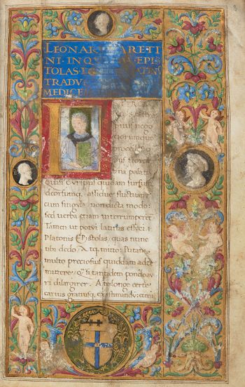 Listy i mowy autorów greckich w przekładach Leonarda Bruni, Pietra Aretina i Francesca Accolti, spisane przez Antonia Sinibaldiego dla Geronima Paola Palavicini. Dekoracja malarska : 1 inicjał figuralny, inicjały malarskie i bordiury roślinne.