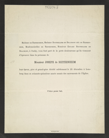 [Nekrolog. Incipit] Madame de Reitzenheim, [...] Monsieur Joseph de Reitzenheim leur époux [...]. - [Miejsce nieznane : wydawca nieznany, 1883] (Imp. Georges Bridel). - [1] karta złożona ; 27x21 cm.