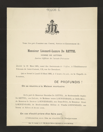 Zawiadomienie o pogrzebie na cmentarzu Montparnasse.