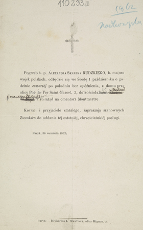 Zawiadomienie o pogrzebie na cmentarzu Montmartre.